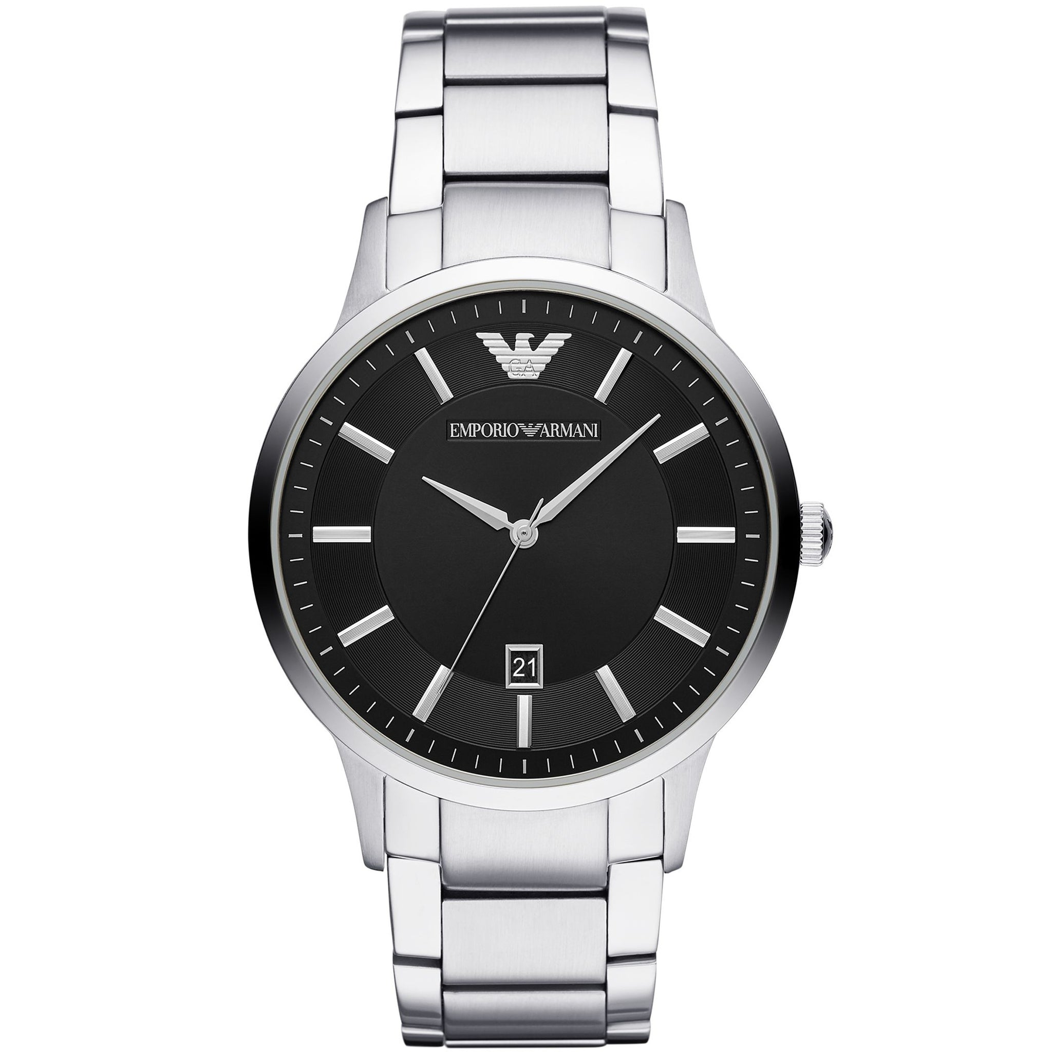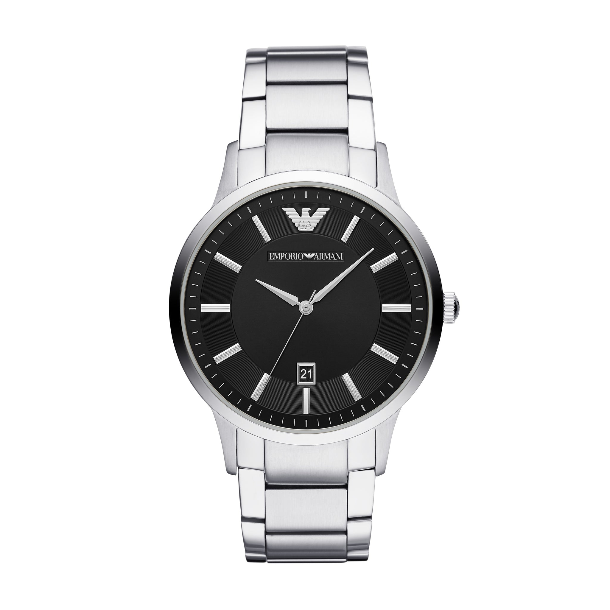 Orologio Tempo con data da Uomo di Emporio Armani della Collezione Renato. Con Cassa rotonda da 43 x 8 mm in Acciaio inossidabile di colore argento, con finitura mista. Vetro  Minerale Trasparente, Quadrante Nero con texture effetto CD. La ghiera è Fissa con finitura Lucida. La distanza delle anse è di 22 mm. Il Bracciale è in acciaio inossidabile di colore argento con finitura mista. La Chiusura è a Deployante a Pulsanti. La Resistenza all'acqua è di 5 atm. Il movimento è Analogico al Quarzo con Funzioni di 3 Sfere con Datario ad ore 6. La referenza per questo prodotto è: AR11181