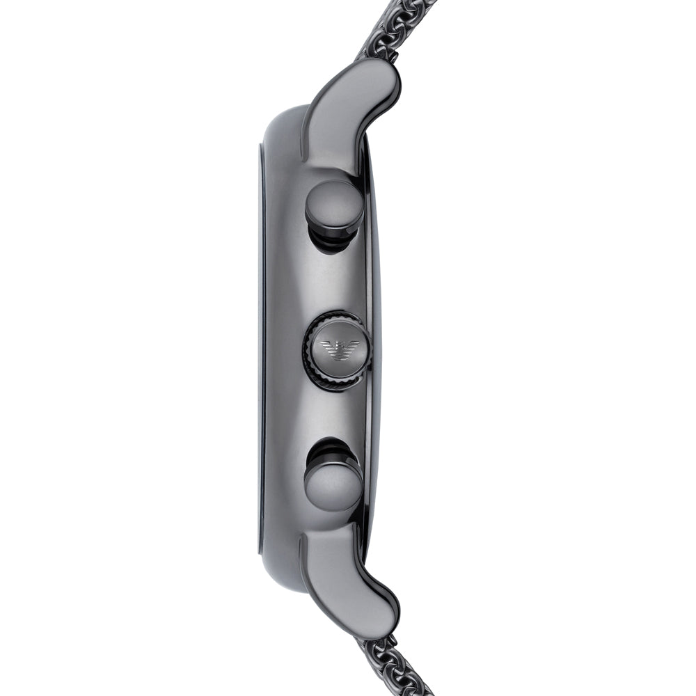 Orologio Cronografo di Emporio Armani da uomo della Collezione Luigi. Con cassa di forma rotonda da 46 x 12mm in acciaio inossidabile Placcato Nero GUNMETAL con finitura lucida. Il vetro è Minerale trasparente, Quadrante con fondo Blu Scuro e la Ghiera è fissa in Tinta e con finitura lucida. La distanza delle anse è di 22 mm. Il cinturino è in Acciaio inossidabile Anallergico Intrecciato ( Maglia Mesh o Maglia Milano) Placcato Nero con finitura Lucida. La resistenza all'acqua è di 5 atm. Il movimento è Analogico al Quarzo con Funzioni di Cronografo e Datario . La referenza per questo articolo è ar1979