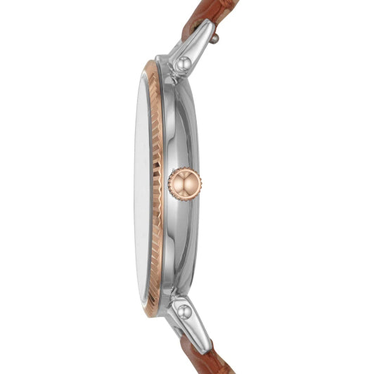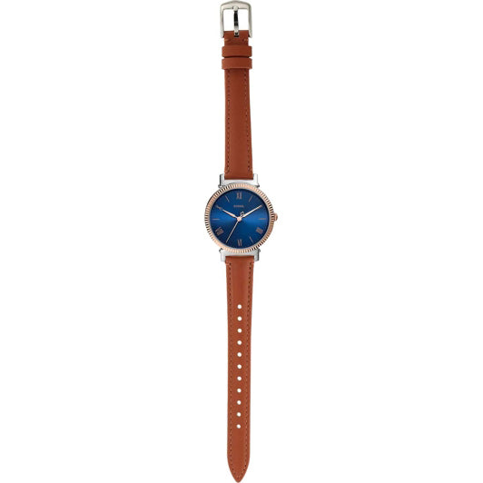 Fossil orologio da donna in pelle Marrone chiaro e quadrante blu scuro con cassa modello slim in acciaio inossidabile anallergico color argento da 34mm, con lunetta zigrinata o sfaccettata placcata oro rosa come anche gli indici, le lancette e la corona. Il Movimento è analogico al quarzo con funzioni di solo tempo a 3 sfere. Vetro minerale trasparente, fondello a pressione in acciaio e resistenza all'acqua di 5 ATM. Un altro dettaglio d'interesse è il cinturino imbottito con le anse a levetta, molto utili per una maggiore facilità di estrazione.