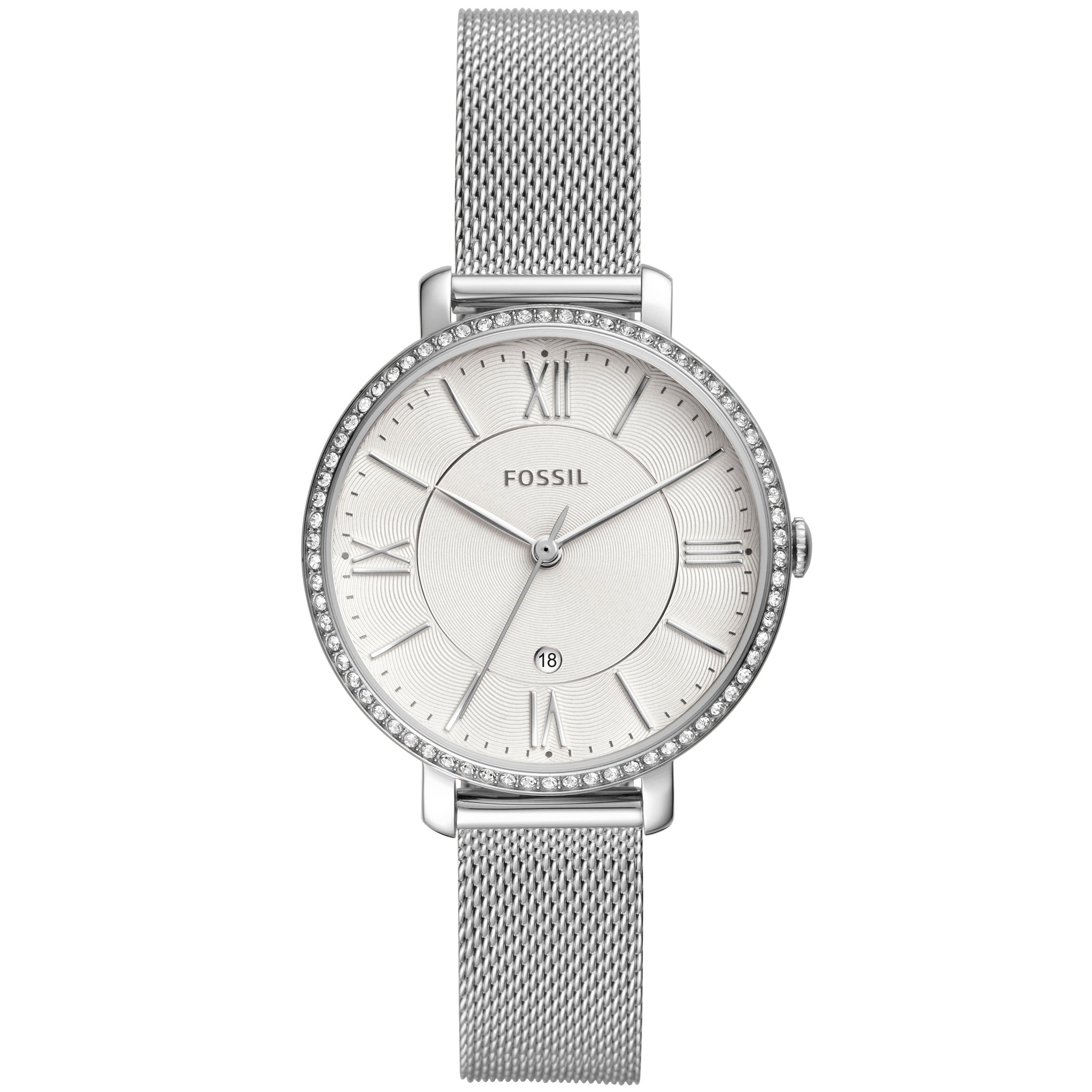 Orologio Solo Tempo Da Donna Di Fossil Della Collezione Jacqueline. Con Cassa Rotonda In Acciaio Inossidabile Con Finitura Lucida Color Argento Di Misura 36Mm E Spessore Di 9 Mm. Vetro Minerale Trasparente e Quadrante di Colore Bianco Con aste e Indici in Numeri Romani color Argento. Ghiera Fissa con Cristalli Applicati. Cinturino a Maglia Mesh ( o Maglia Milano) in Acciaio Inossidabile Anallergico E Anse a Levetta da 14 Mm. Modello Con Movimento Al Quarzo Con Tre Sfere E Datario a ore 6 .Resistenza All'Acqua Di 3 Atm. La Referenza È ES4627