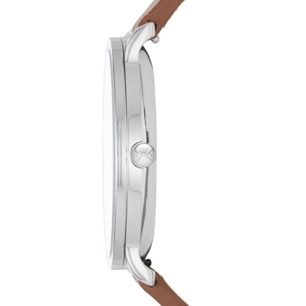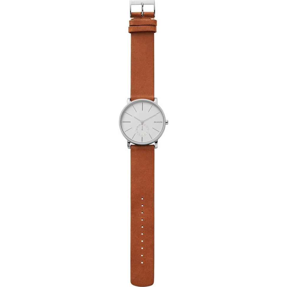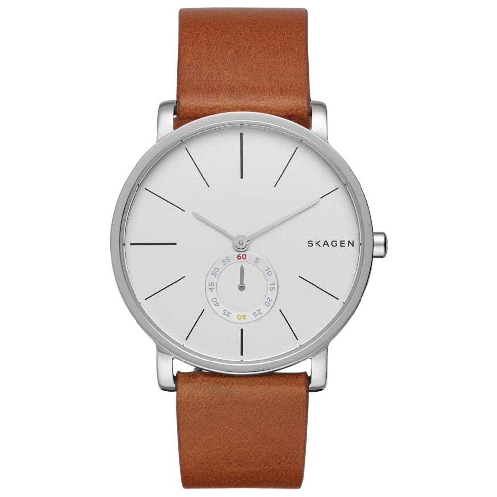 Orologio Solo Tempo di Skagen della collezione Hagen. Con Cassa da 40 x 8 mm in Acciaio Inossidabile anallergico Colore Argento con finitura Lucida. Vetro Minerale Trasparente, Fondello a Pressione in Acciaio e Quadrante color Argento Opaco. Il Cinturino è in Pelle colore Marrone, la Chiusura è a Fibbia ad Ardiglione. Resistente all'Acqua fino a 5 ATM (50 Metri). il Movimento è Analogico al Quarzo con Funzioni di 3 Sfere con Secondiera a Ore 6.