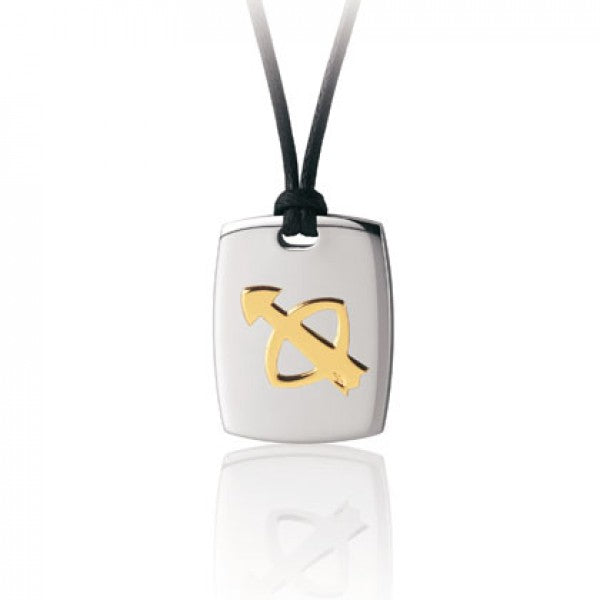 Collana Unisex di Nomination con pendente Sagittario in Acciaio e Oro 18 Kt e laccio in Cotone Cerato nero. Questo Pendente è costituito da una lastra in Acciaio Inossidabile Anallergico spessa 1,5 mm, di forma rettangolare con i lati leggermente ricurvi delle dimensioni di 17 x 22 mm ed una lastra in Oro 18 kt dal peso di gr 0,30 sagomata a forma di Segno Zodiacale saldata di sopra ed in questo caso del segno del Sagittario. La lunghezza del laccio e variabile grazie a dei nodi corsoi che ne permettono l'apertura per indossarlo e l'opportuno aggiustamento una volta indossato.