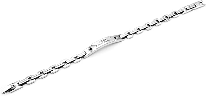 Gioiello 4US Jewels di Cesare Paciotti. Bracciale Da Uomo in Acciaio Inossidabile Anallergico con finitura Lucida e Satinata Color Argento e Pietre Nere. Realizzato con maglie impernate e Targhetta centrale loggata impreziosita da due pietre Nere applicate. La larghezza del bracciale è di 8mm Mentre la lunghezza totale è regolabile da 19,5cm fino a 21,5cm grazie alle ultime due maglie che sono Chiusure a Pressione. La Referenza Di Questo Prodotto è 4UBR0733