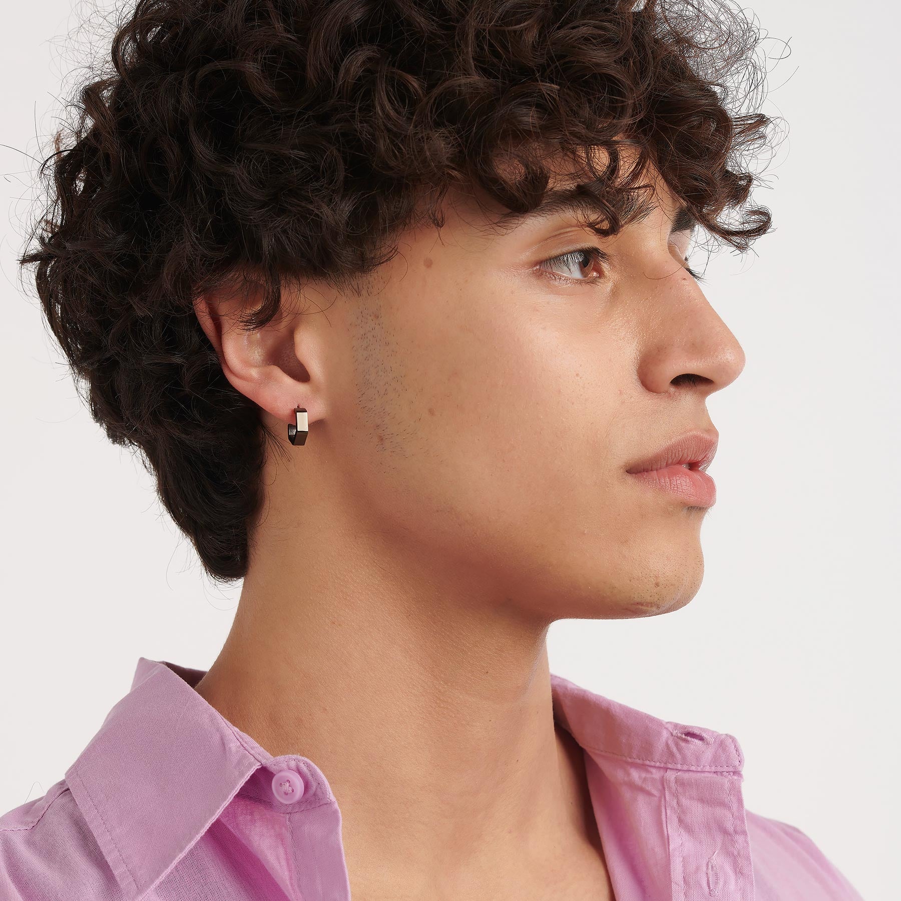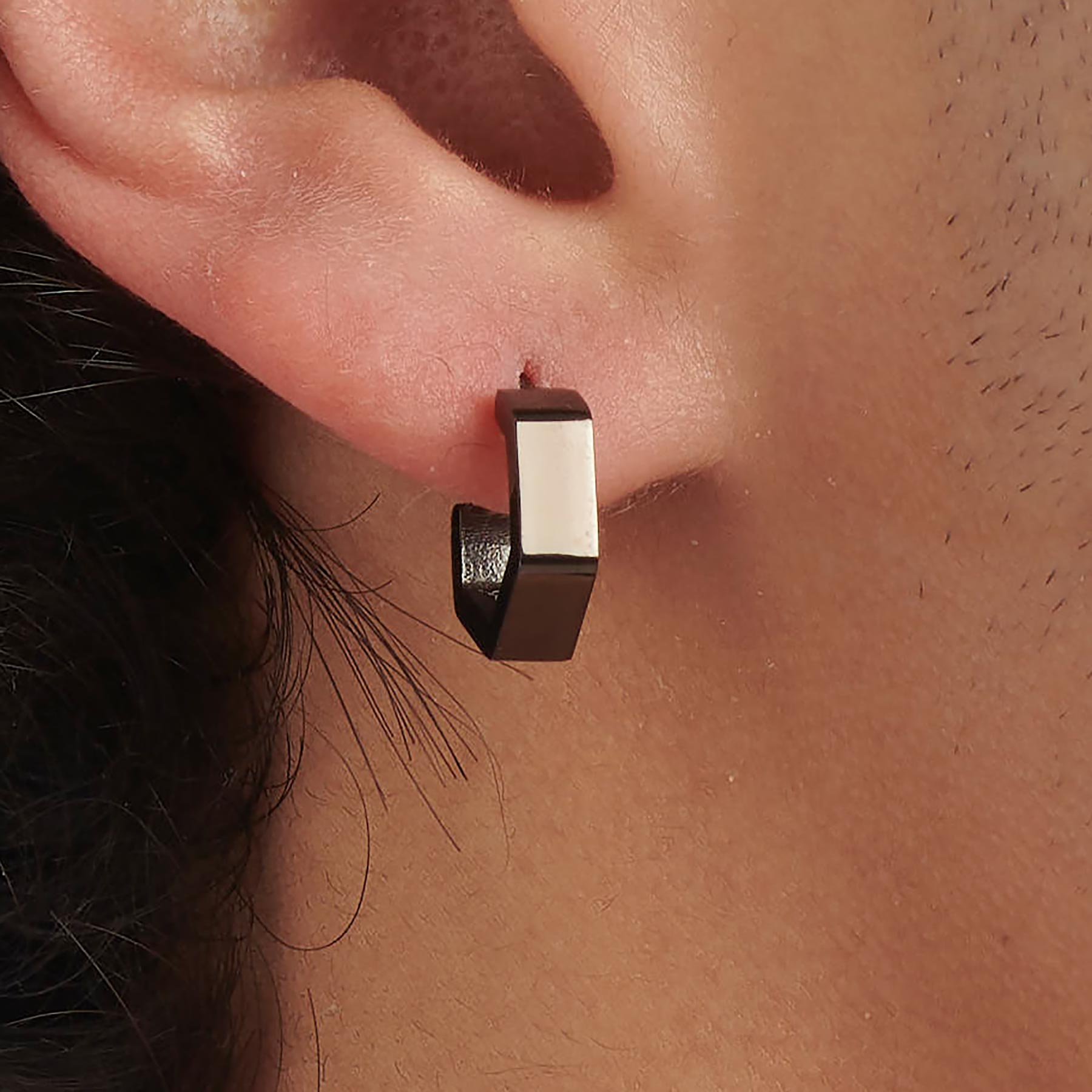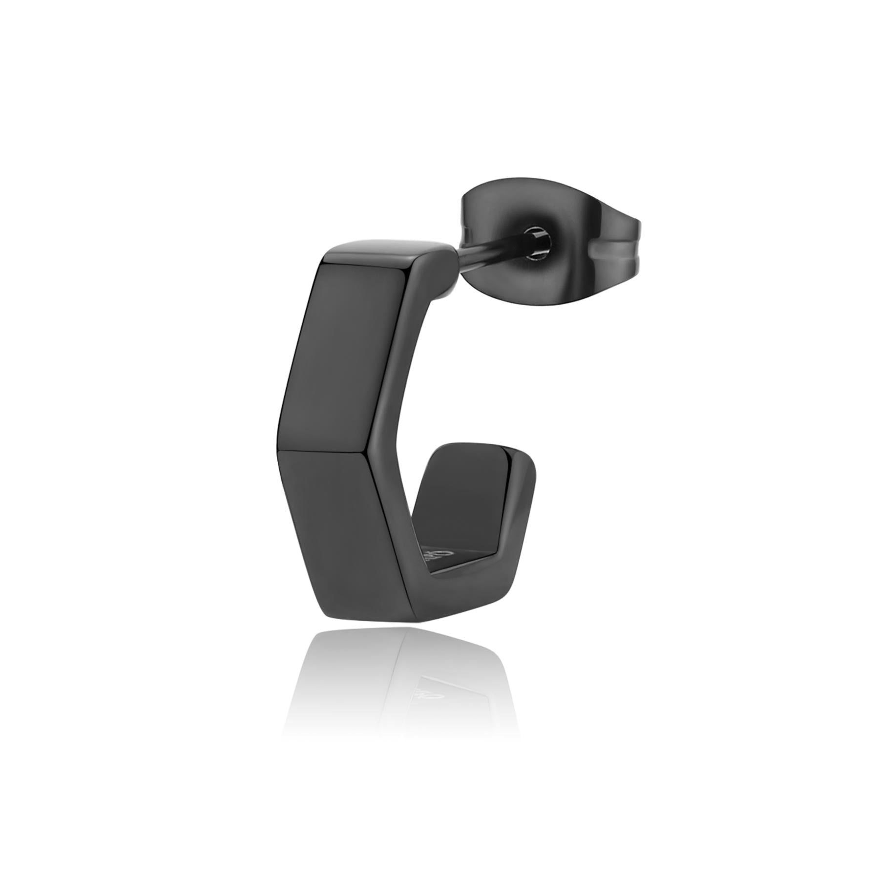 Orecchino singolo modello a Cerchio ma di forma di dado esagonale con aggancio a perno e farfalla per uomo (ma anche per donna) in acciaio lucido con trattamento PVD color rutenio di S'AGAPò Gioielli per la collezione Rogue. Realizzato in acciaio 316L inossidabile ed anallergico.