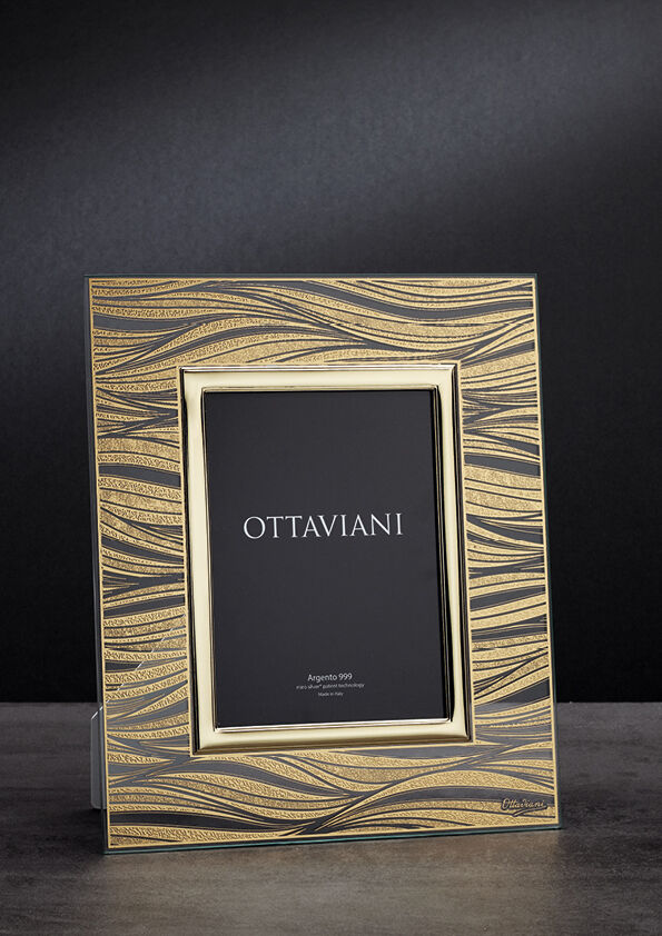 Originale portafoto con lastra dorata e Cristallo con decoro a righe ricurve placcate in Oro Giallo che ricordano le onde del mare. Semplice ma d'effetto questo portafoto è abbinabile su tutti i tipi di arredamento e consigliato come regalo da matrimonio.